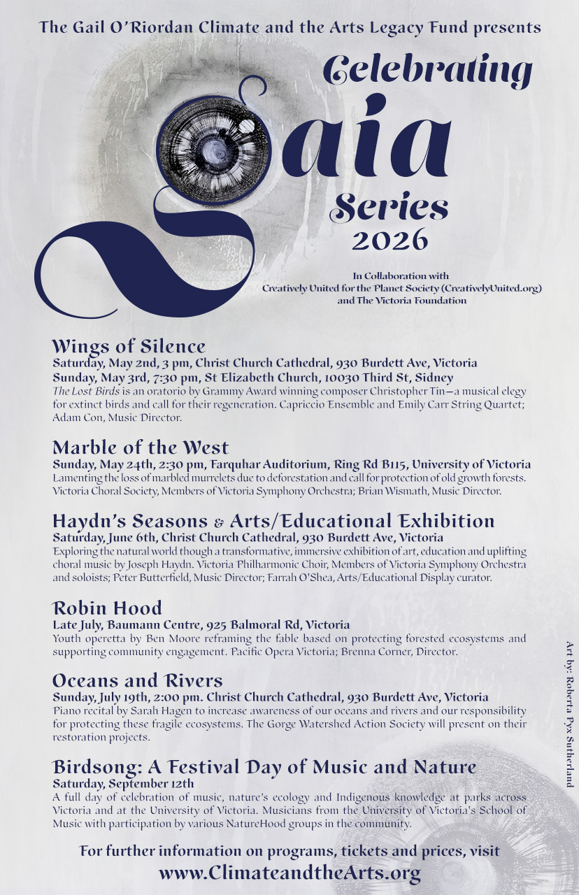 A second performance on Sunday, May 3, at St. Elizabeth Catholic Church, 10030 Third St, Sidney will feature a special 20-minute pre-concert guest presentation (at 7 pm) by Dr. Tracy Underwood, W̱SÁNEĆ Matriarch and Professor at the University of Victoria, offering an insightful Indigenous perspective on stewardship, knowledge, and connection to the land. Audience members are also invited to explore information tables hosted by local nature and conservation groups before and after the performance.